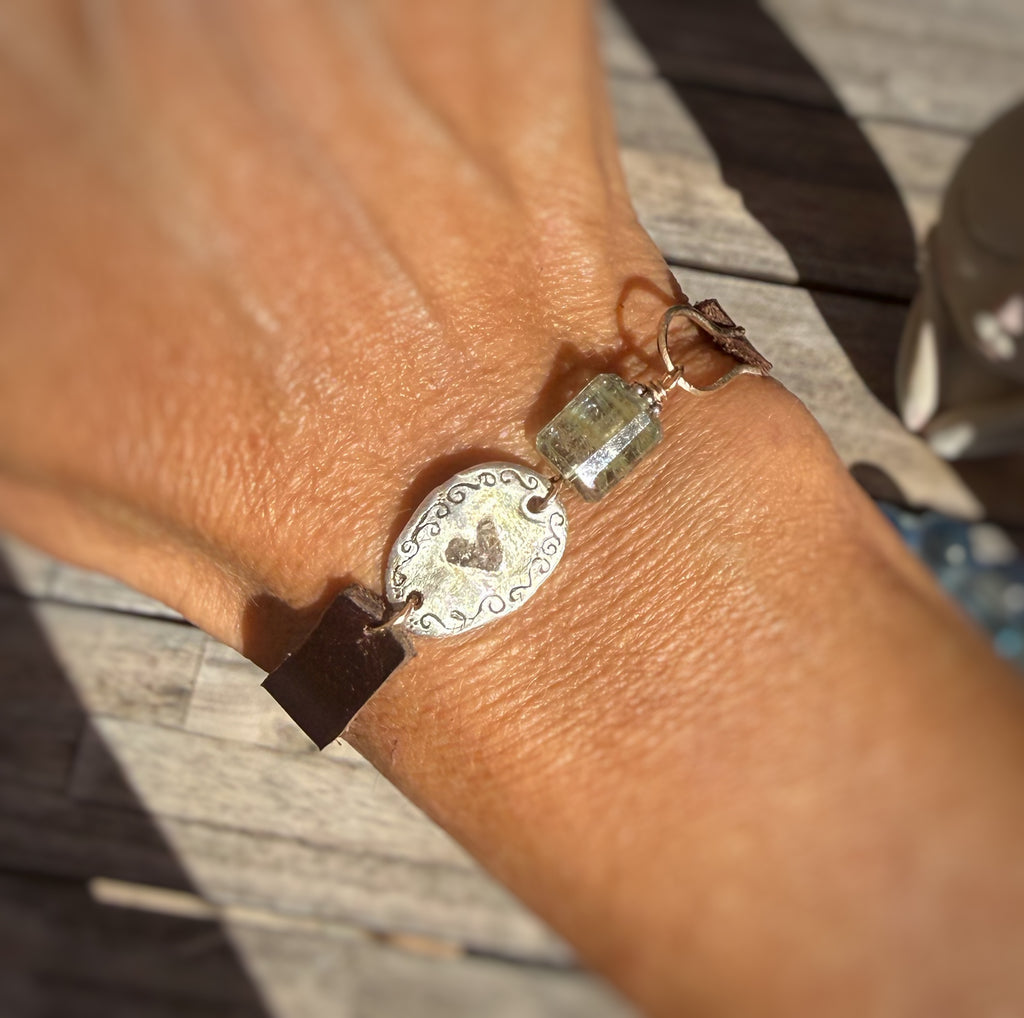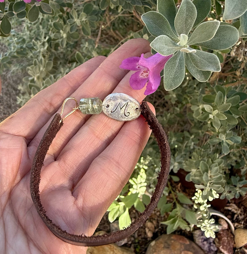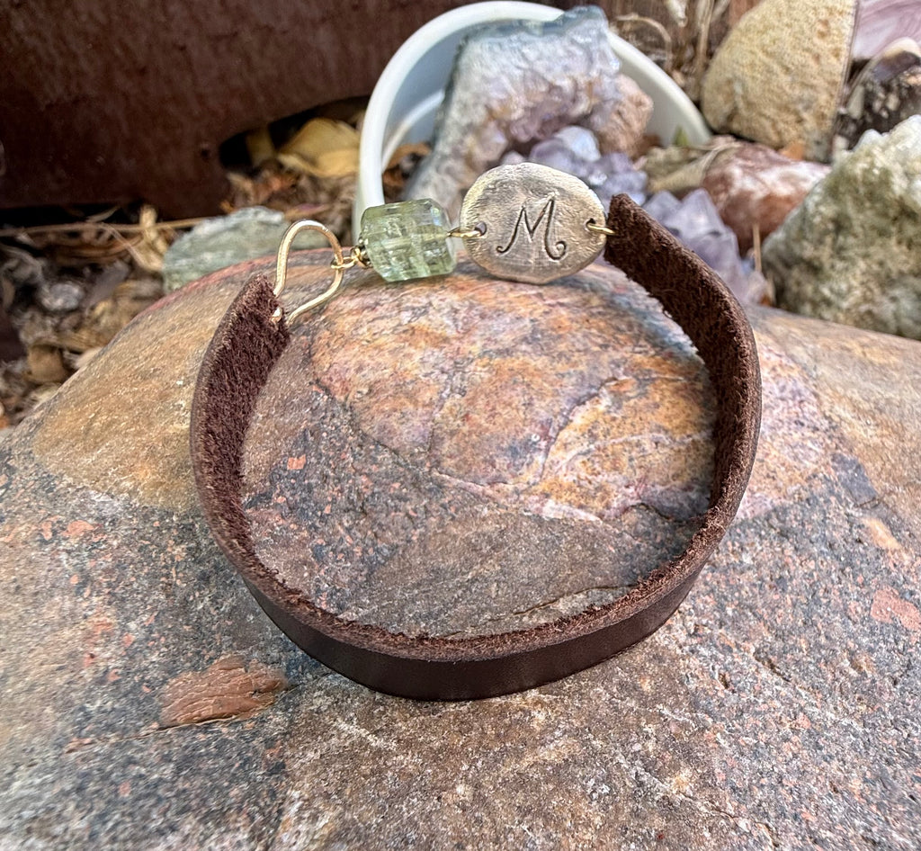 This stunning bracelet is made with leather, sterling silver, crushed raw diamond, a gorgeous aqua marine, leather and 12kt gold filled components. You can customize it with an initial on the back or leave it blank. It can also be made larger or smaller. Email me with any customizations after you place the order: cindy@mlfjewelry.com