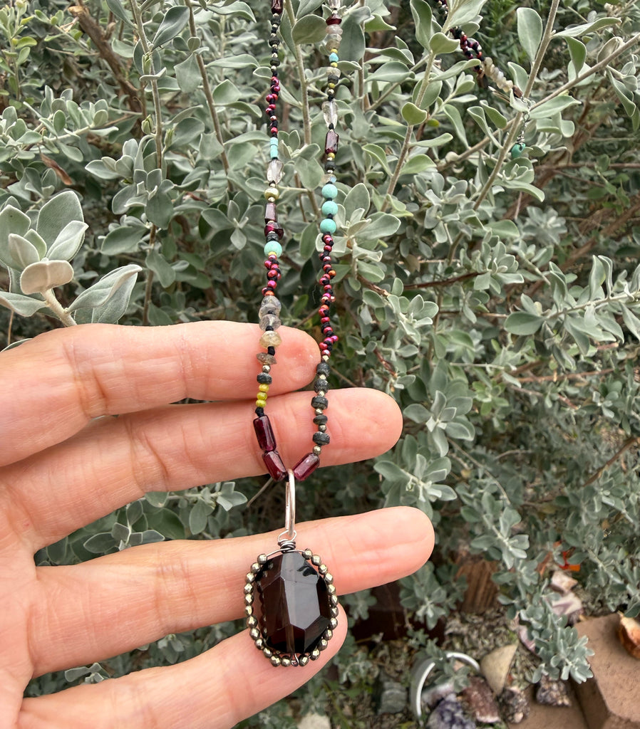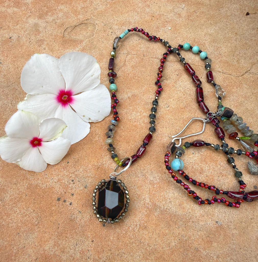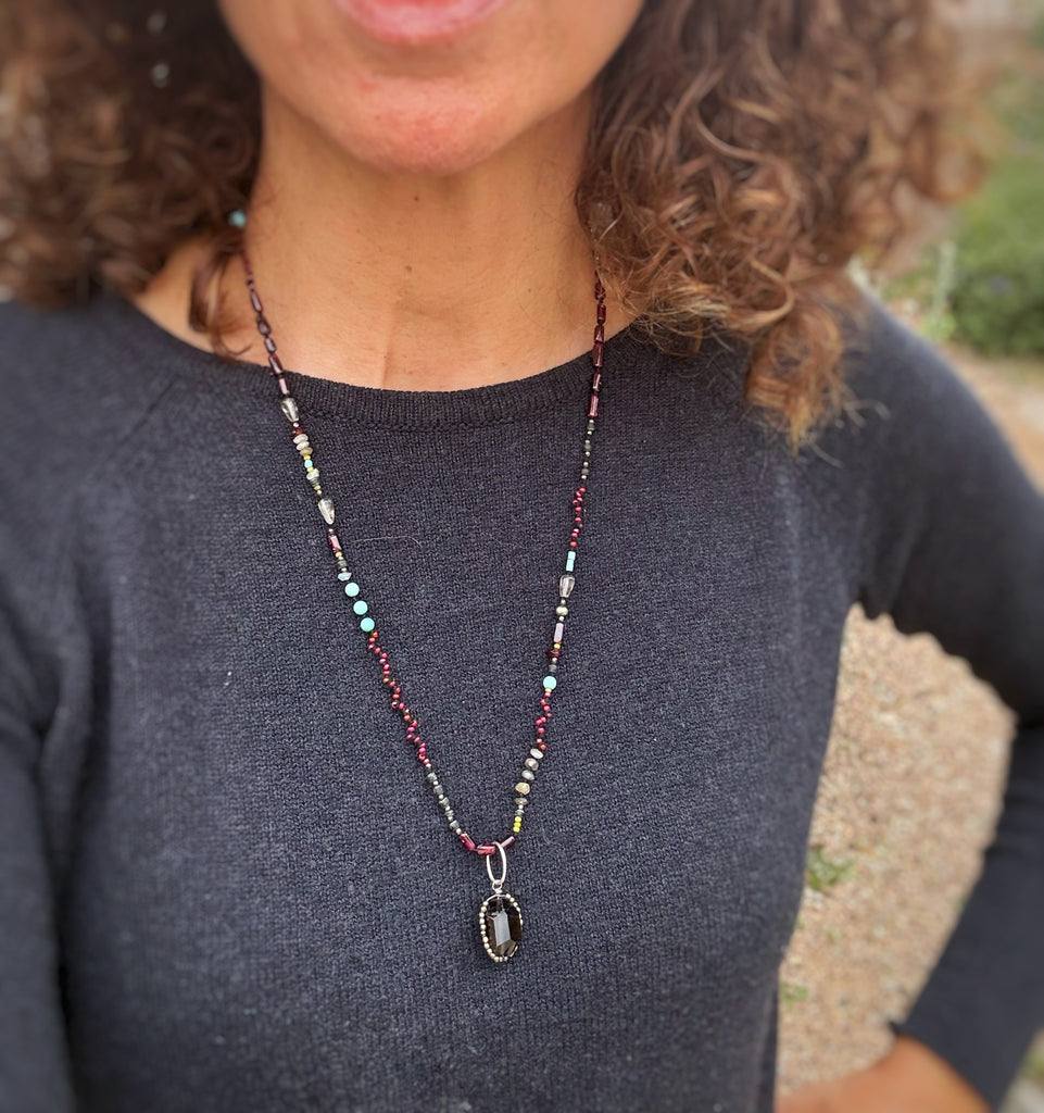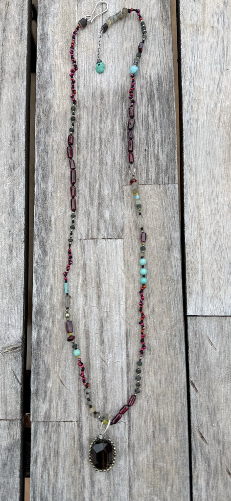 This gorgeous extra long necklace measures up to 26 inches and is made with garnet, turquoise, smoky quartz, labradorite and sterling silver.