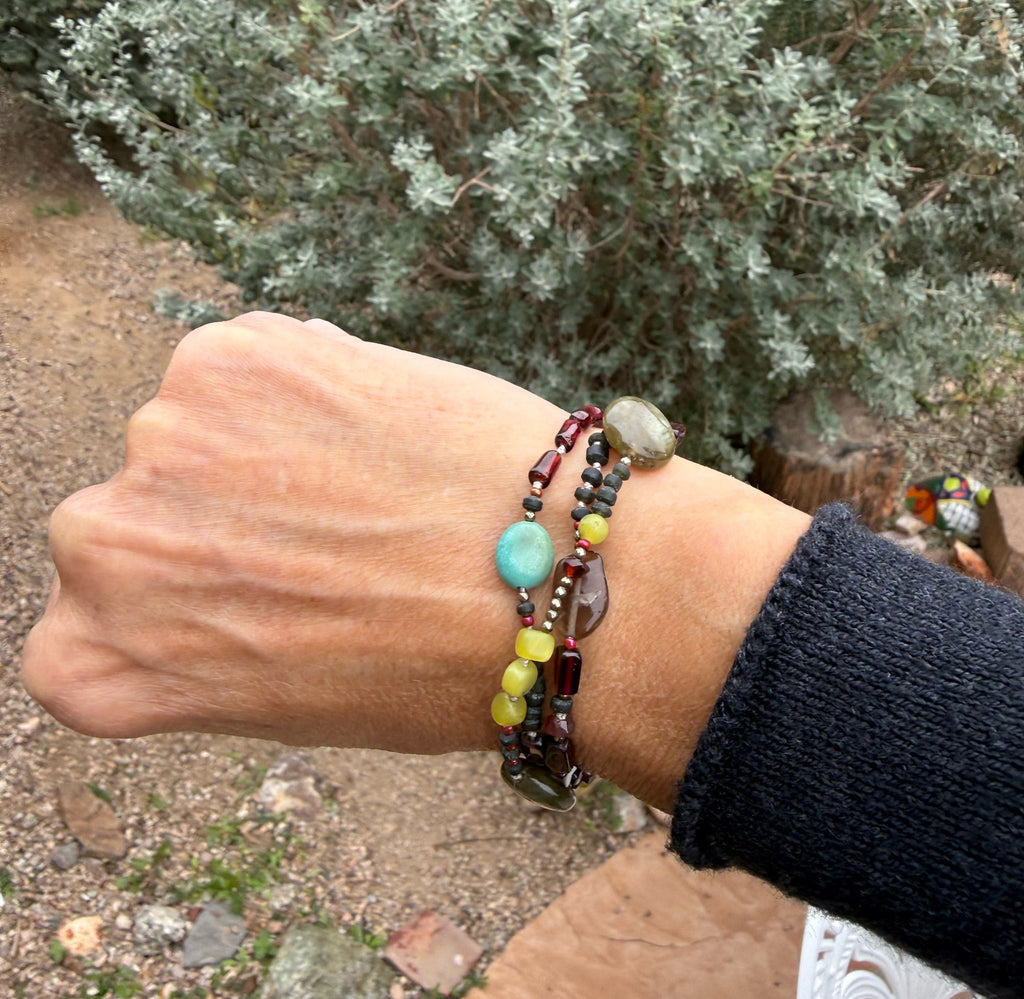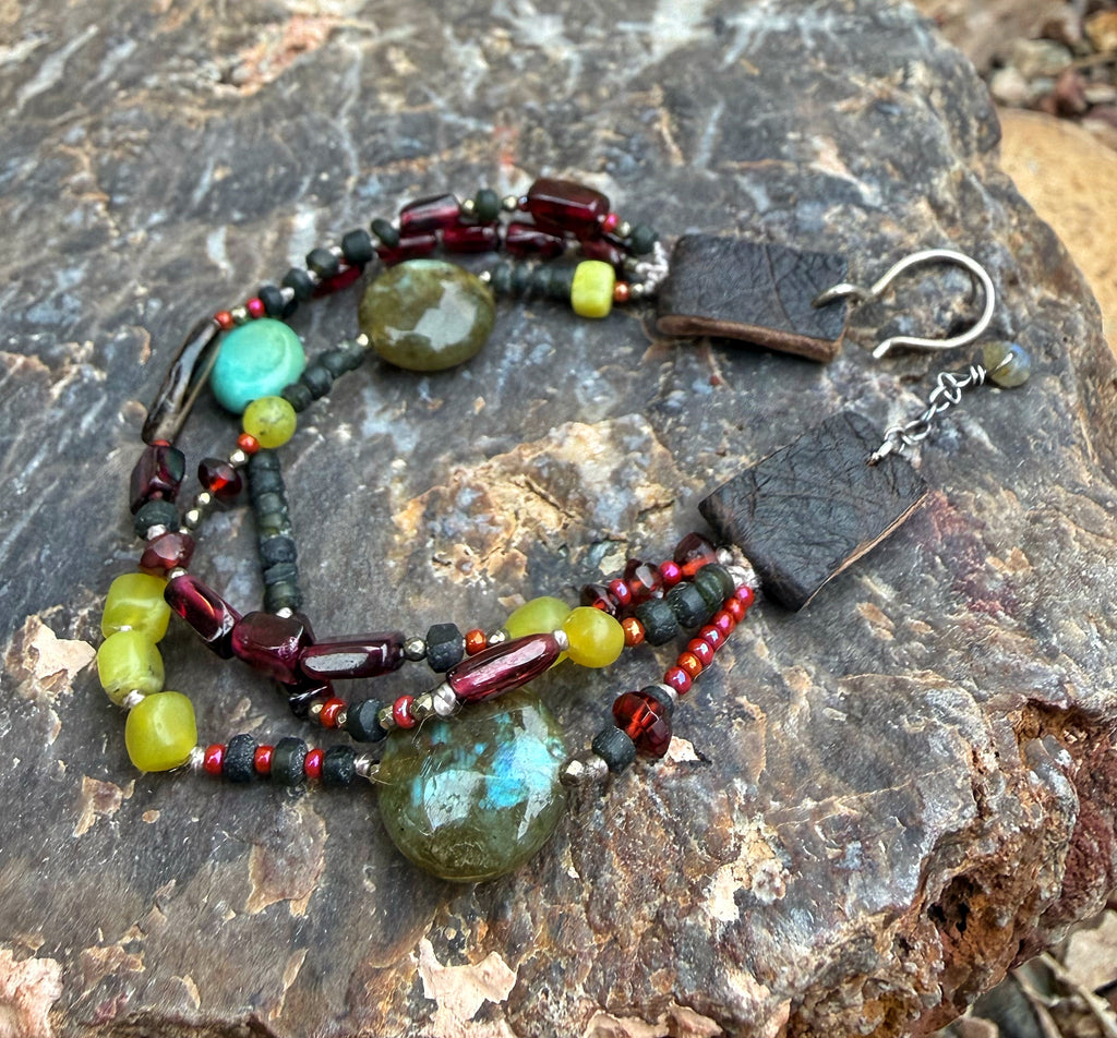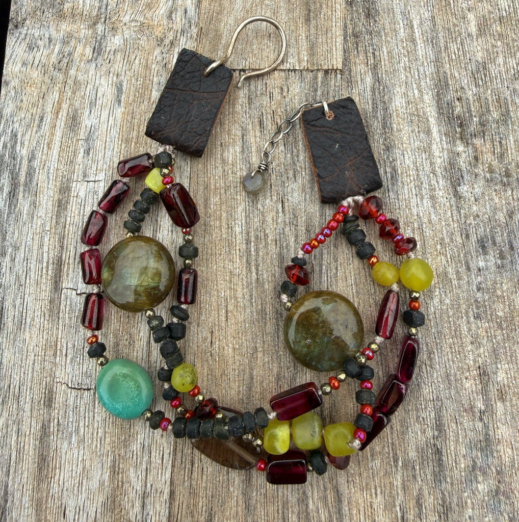 This stunning 3 stranded bracelet is slightly adjustable and is made with garnet, smoky quartz, turquoise, anmazonite and gorgeous labradorite. Finished with sterling silver and leather touches.