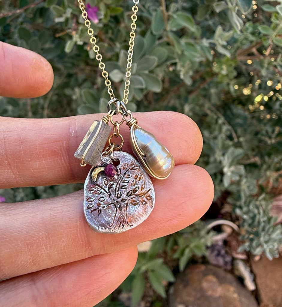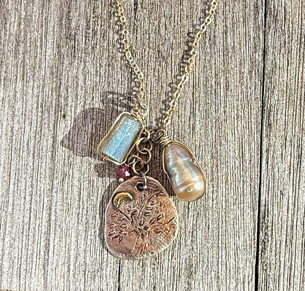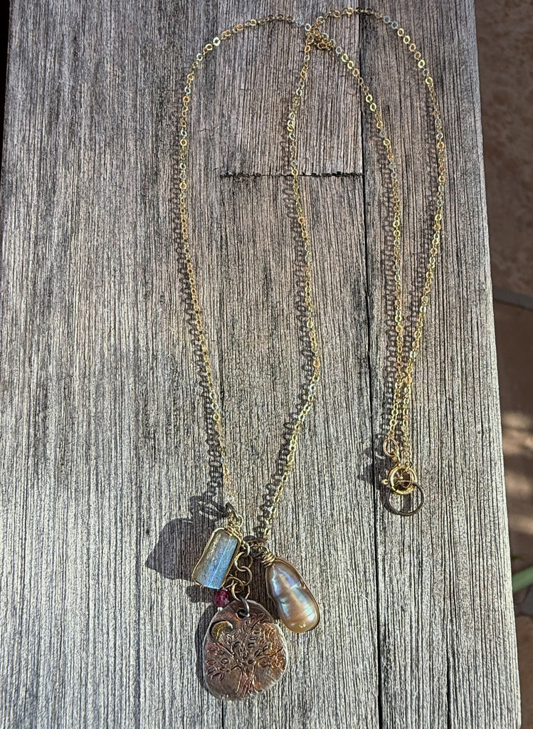 Made with an 18 inch 14 KT gf chain, labradorite, pearl, garnet and sterling silver.