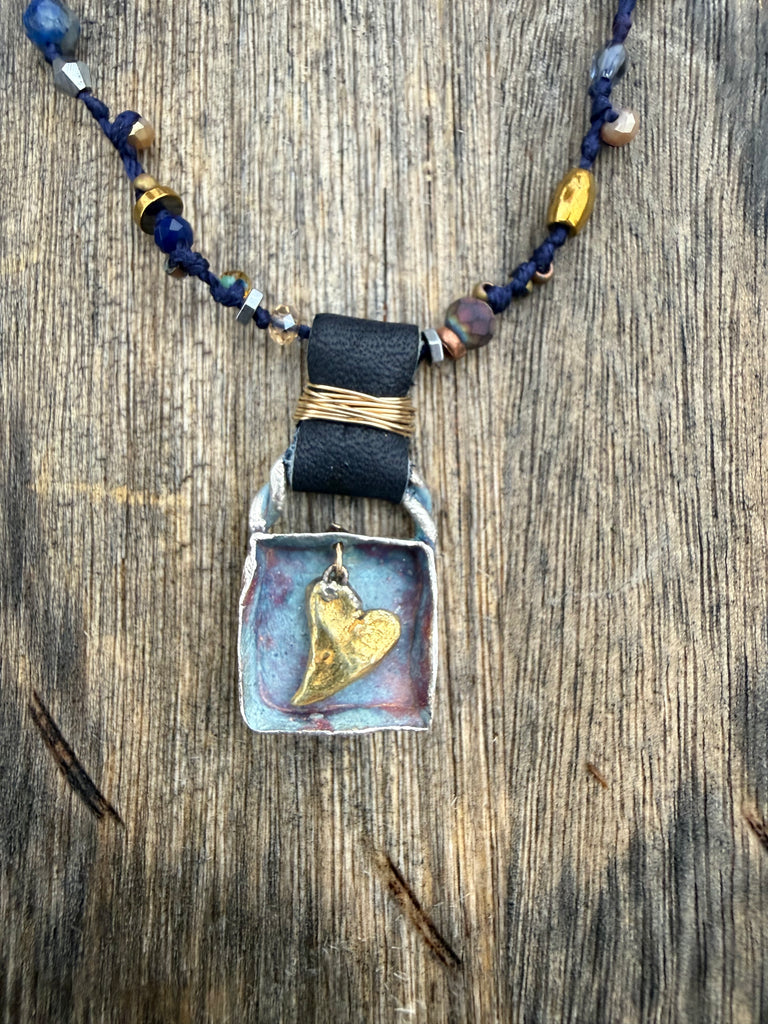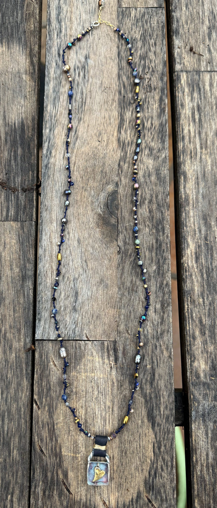 Adjustable up to 28 inches, this midnight crystal blue and pearl necklace has at its center a handmade silver pendant with a 24kt gold plated heart dangling within. Finished with leather, gold filled and sterling silver accents- you will cherish this unique piece.